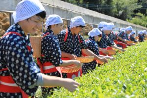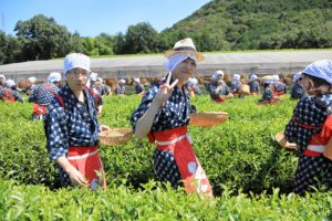 みんなでお揃い茶摘み娘スタイルで、本物のお茶摘み体験!