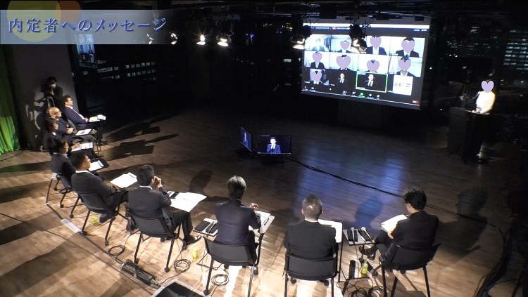 ライブ配信会場には会長、社長をはじめとする役員、部長陣が揃い、内定者の皆さん&社員と中継で繋がって式が執り行われました。