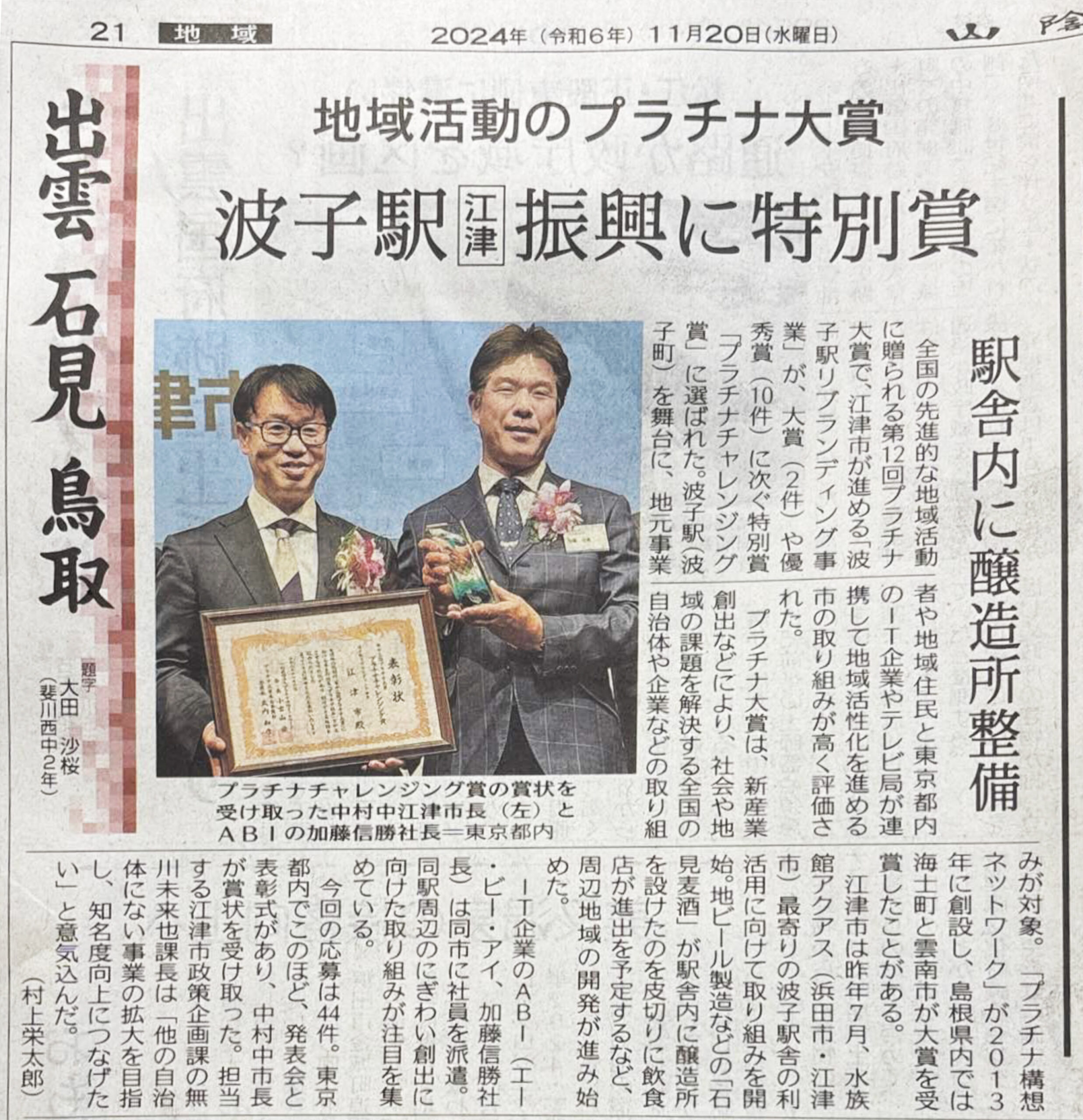 〈新聞掲載〉江津市との取り組みにおける「プラチナチャレンジング賞」受賞が新聞に掲載されました。