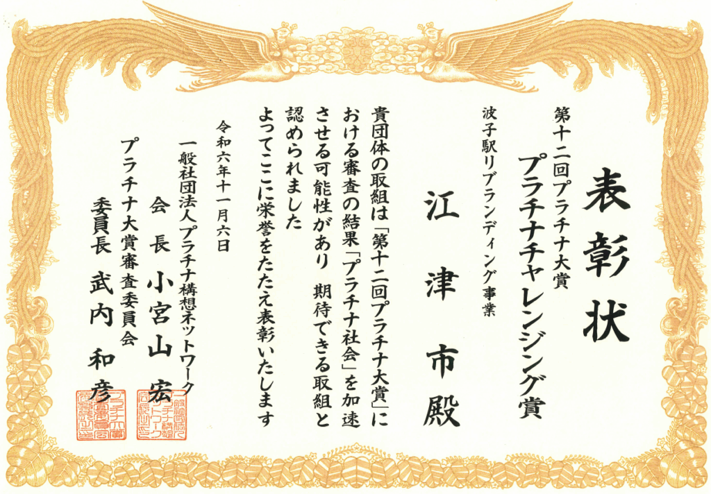 弊社が江津市と共に取り組む地方創生事業が、「プラチナ大賞」(主催:一般社団法人プラチナ構想ネットワーク プラチナ大賞運営委員会)にて、「プラチナチャレンジング賞」を受賞いたしました。