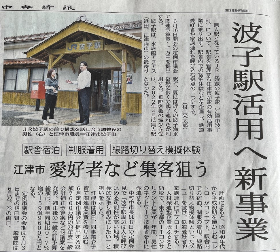 6月9日付 山陰中央新報にて、弊社が江津市と共に取り組む地方創生プロジェクトの活動が紹介されました。(人材派遣型企業版ふるさと納税、駅活用プロジェクトの取り組みが取り上げられています) <デジタル版>https://www.sanin-chuo.co.jp/articles/-/397768